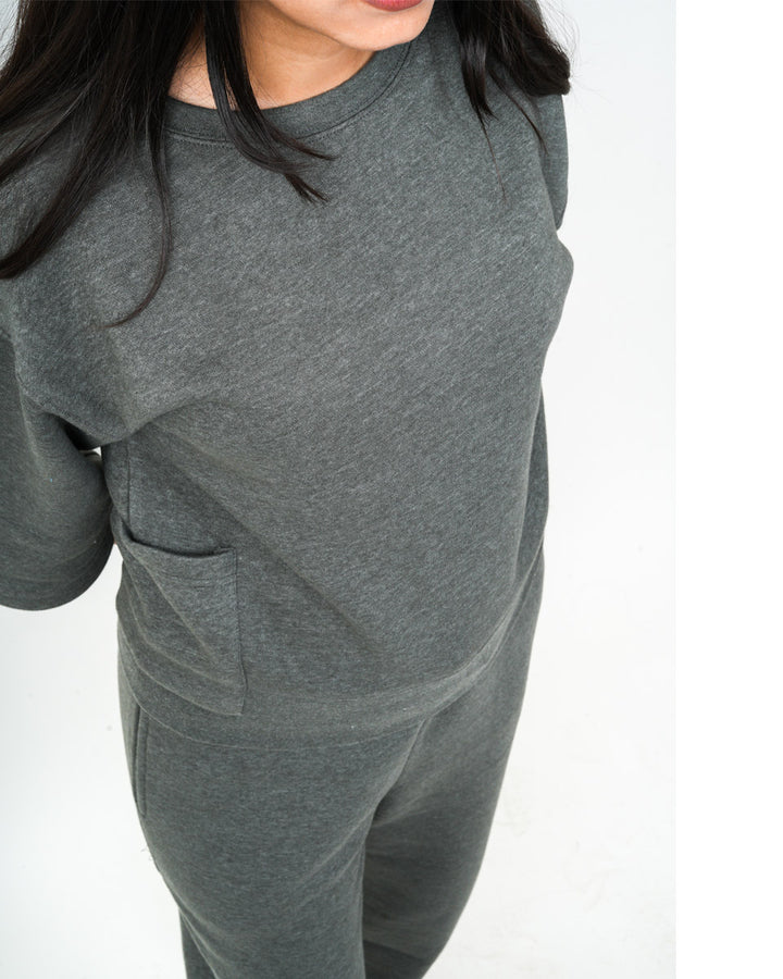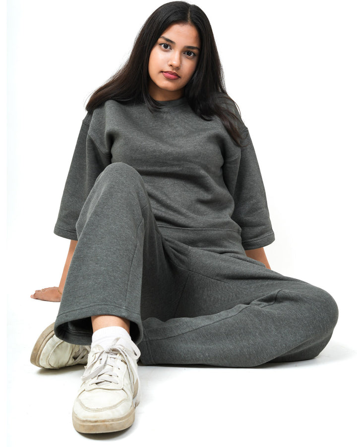 The sweatshirt redefines casualwear with a clean, contemporary cut and a unique touch: a discreet yet functional side pocket that adds utility without bulk. The matching trousers feature a flattering straight-leg fit that moves beyond traditional track pants with pockets, offering a sleek, elongated silhouette that works for both lounging and light outings.
