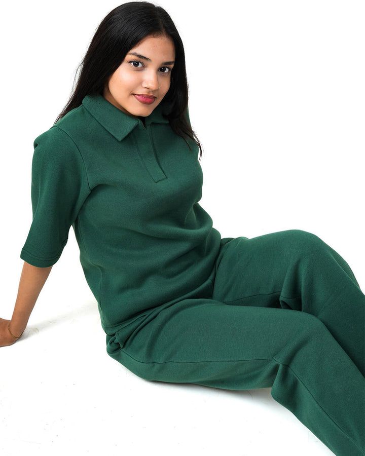 Step into effortless comfort with this deep green co-ord set, (NAME) featuring a warm, soft-textured collared sweatshirt and relaxed-fit trousers with pockets for your ease. Perfect for cozy days or casual outings, this set blends minimal style with all-day ease — your go-to for a chic, laid-back look.